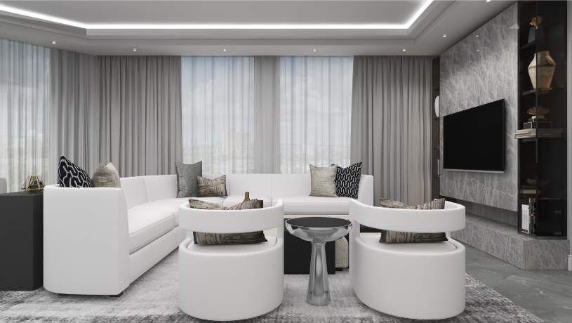 Luxurious living room interior designed by Sourced Interiors, Miami — soft neutral palette with layered textures