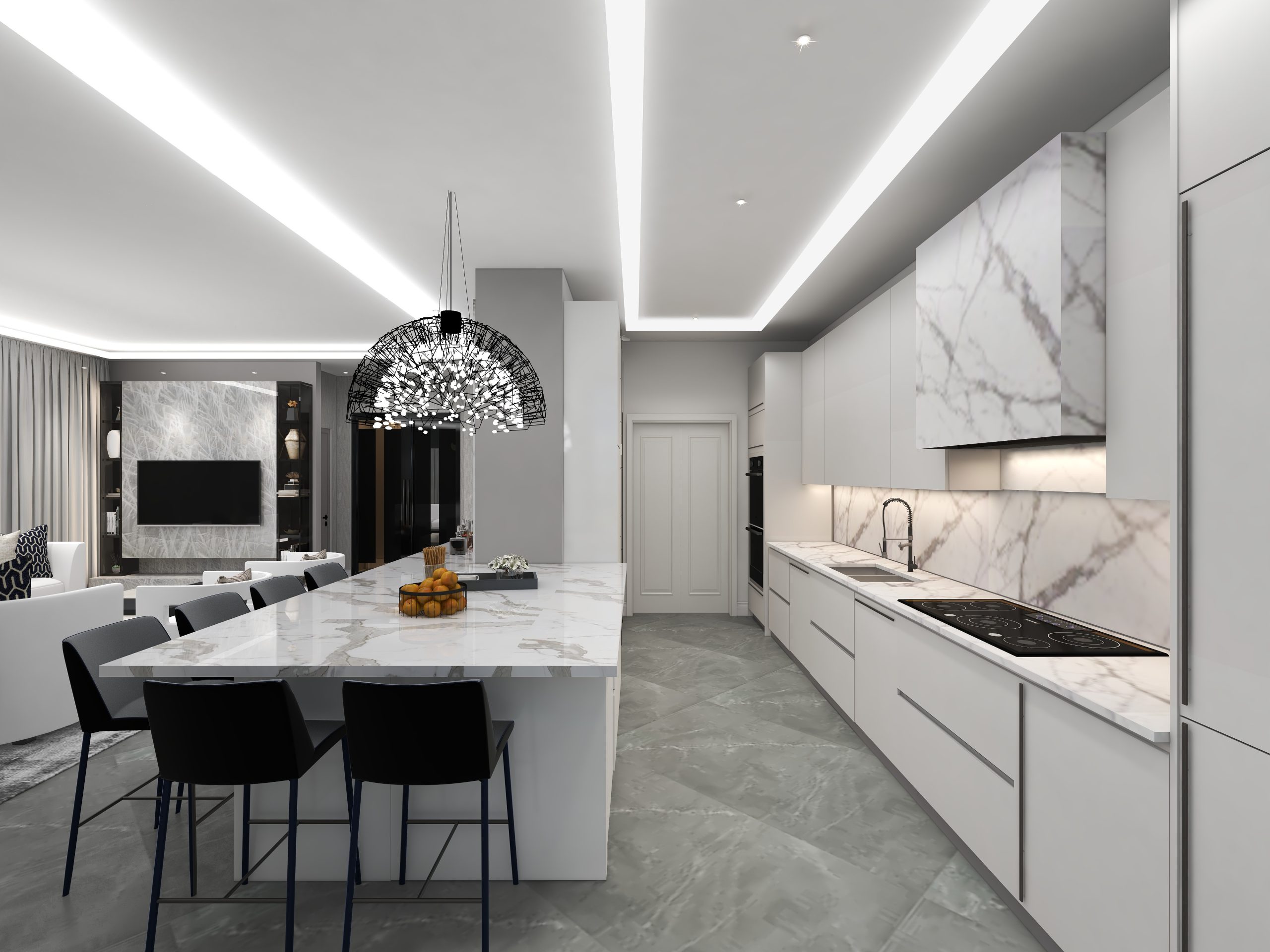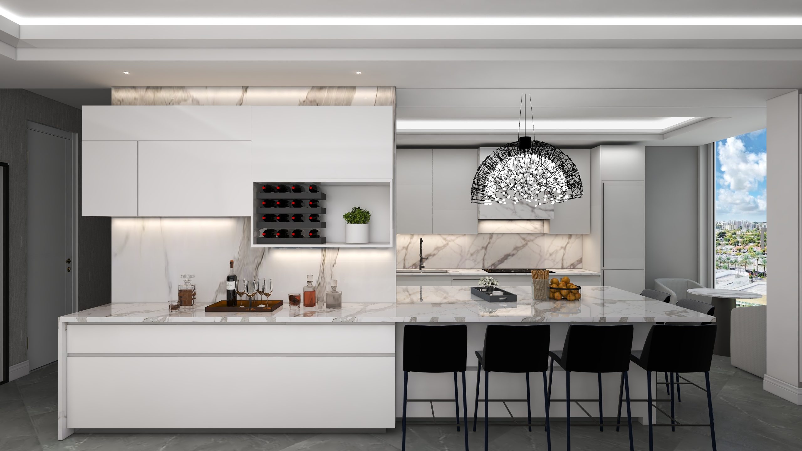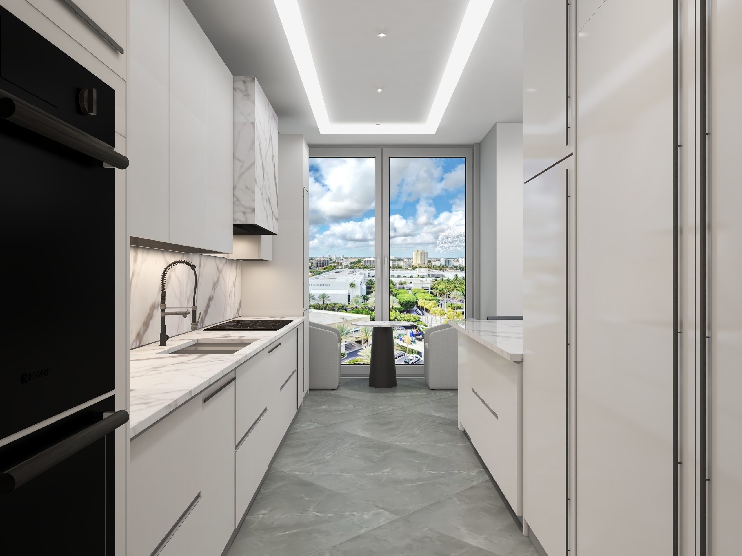 Modern Miami condo kitchen by Sourced Interiors — sleek cabinetry, marble countertops, and designer lighting