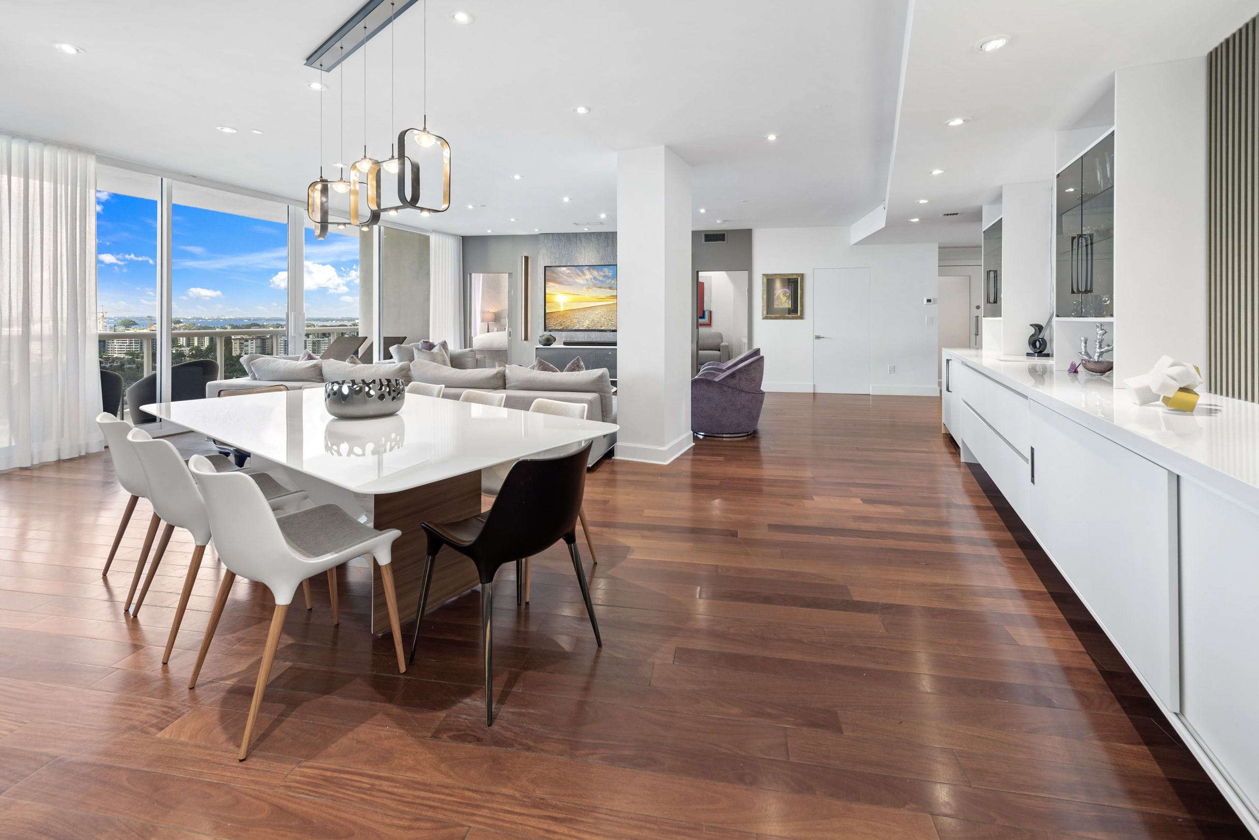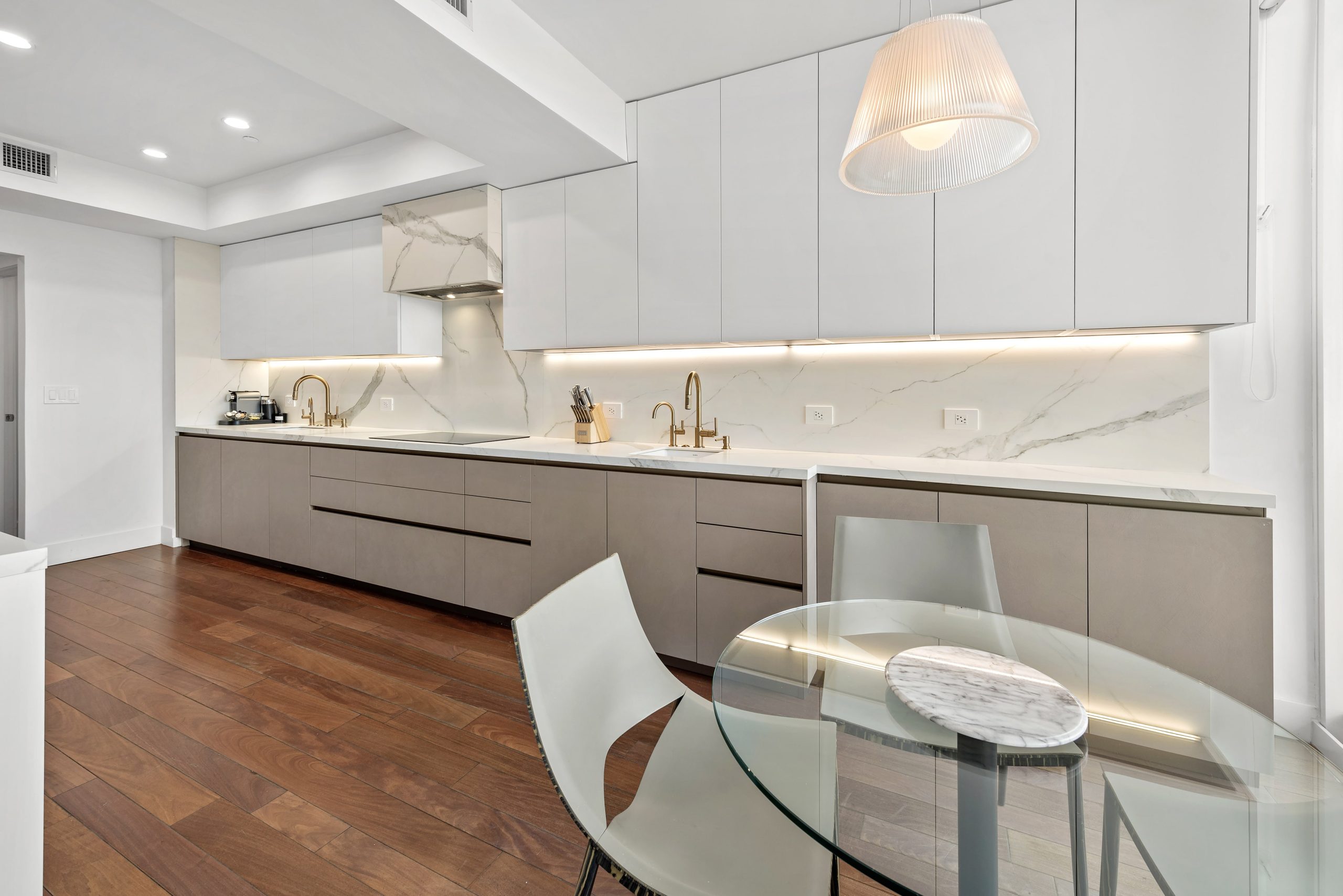 Modern Miami condo kitchen by Sourced Interiors — sleek cabinetry, marble countertops, and designer lighting