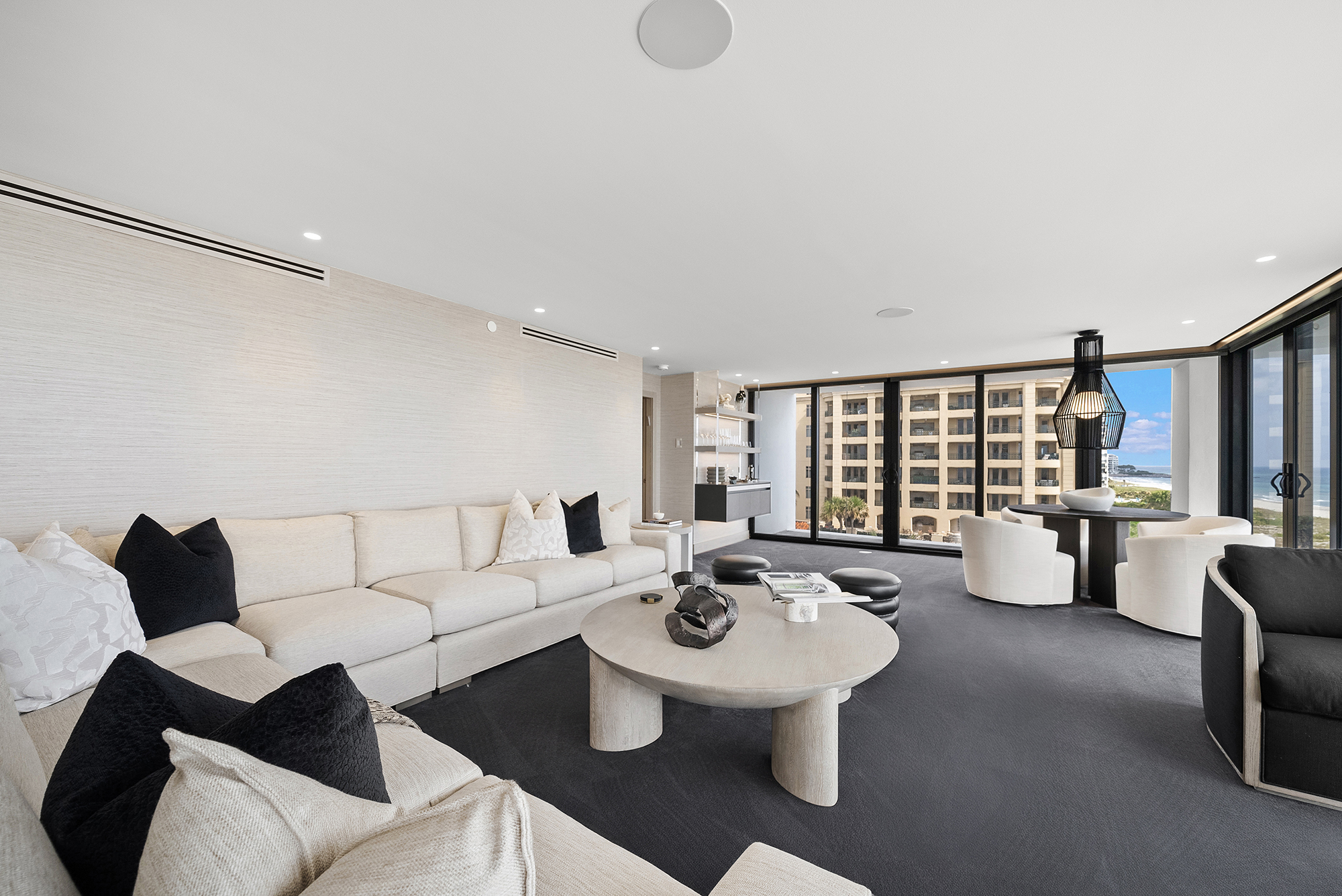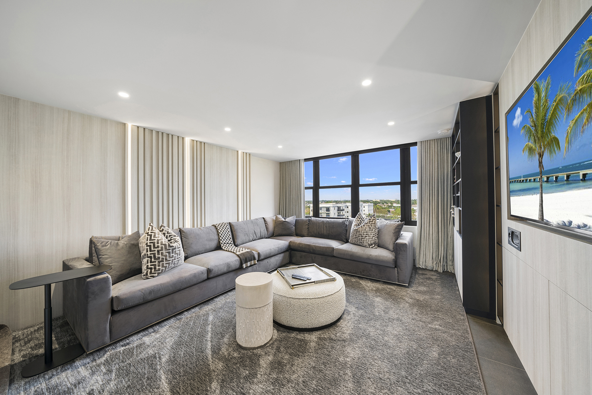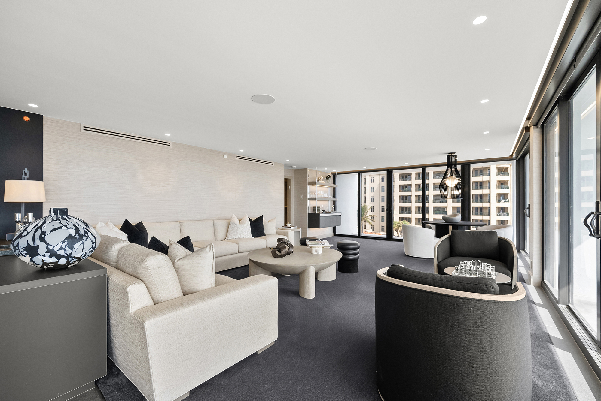 Luxurious living room interior designed by Sourced Interiors, Miami — soft neutral palette with layered textures