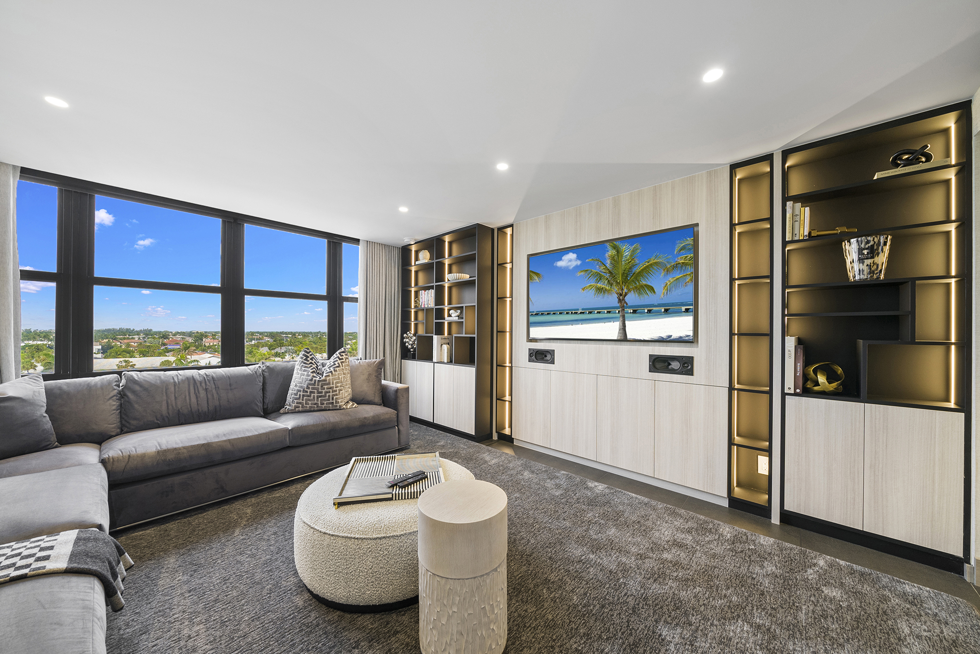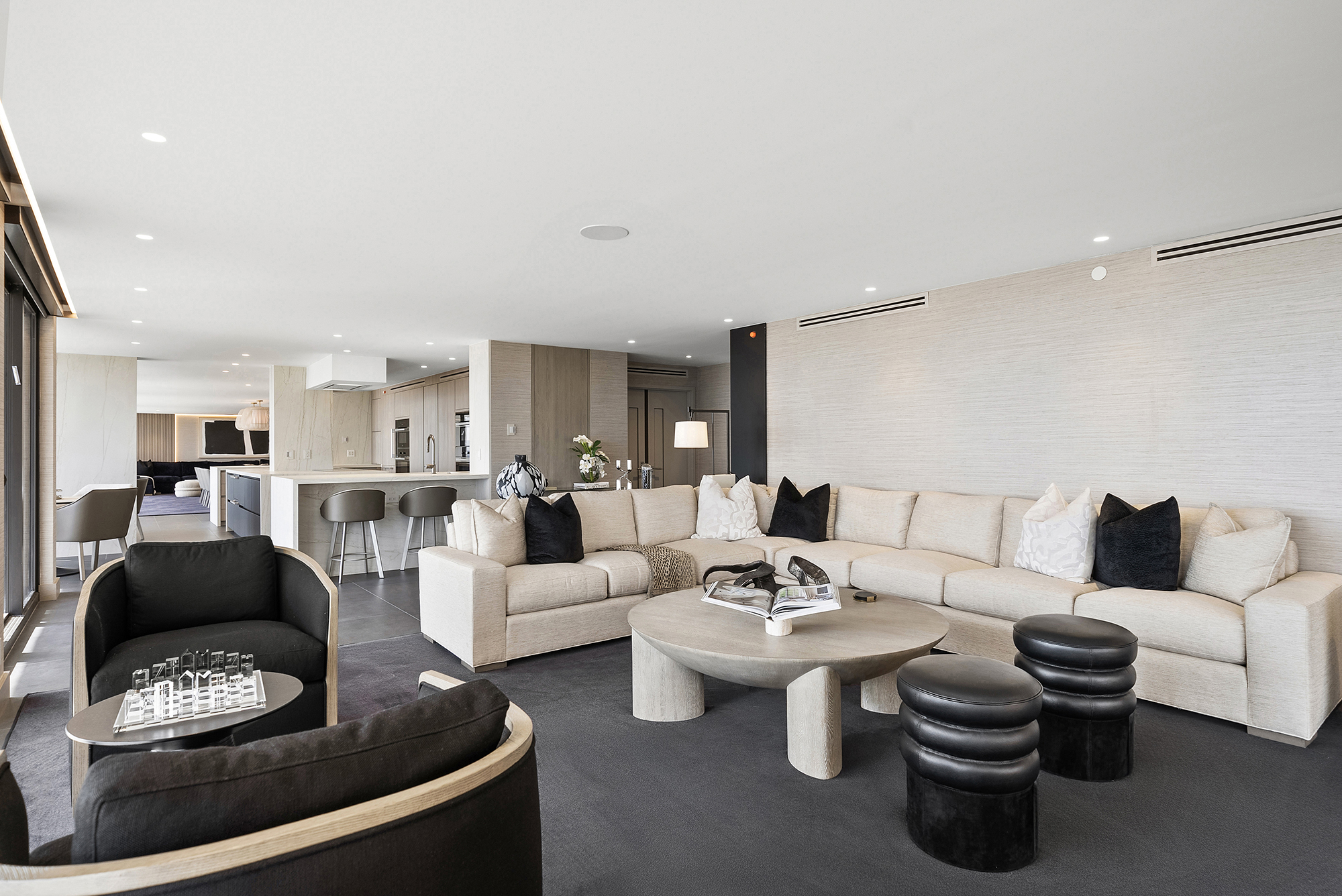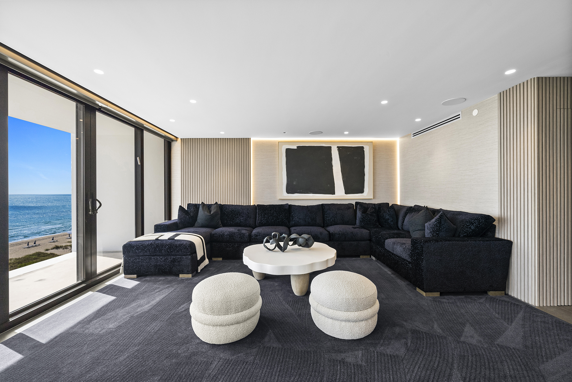 Luxurious living room interior designed by Sourced Interiors, Miami — soft neutral palette with layered textures