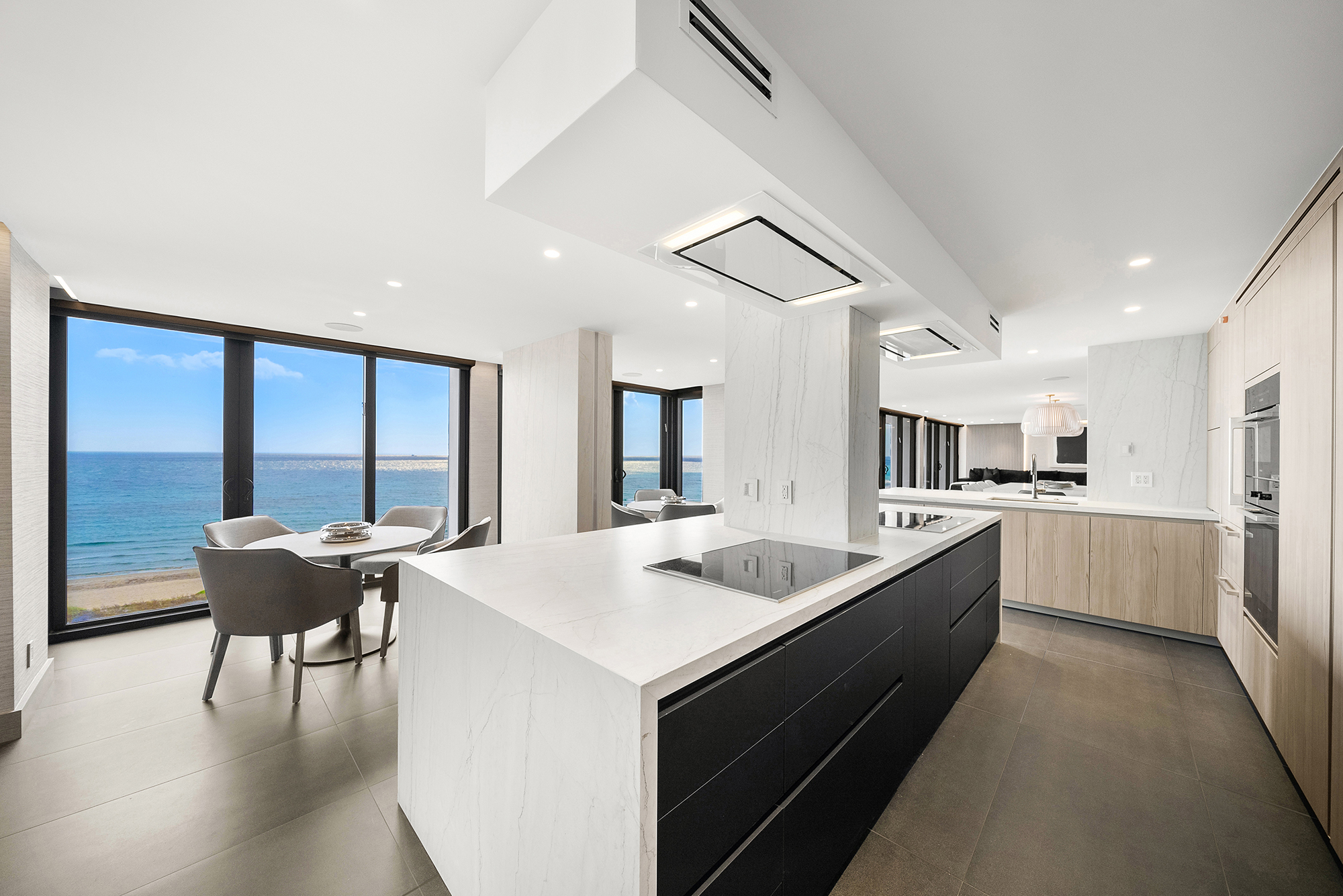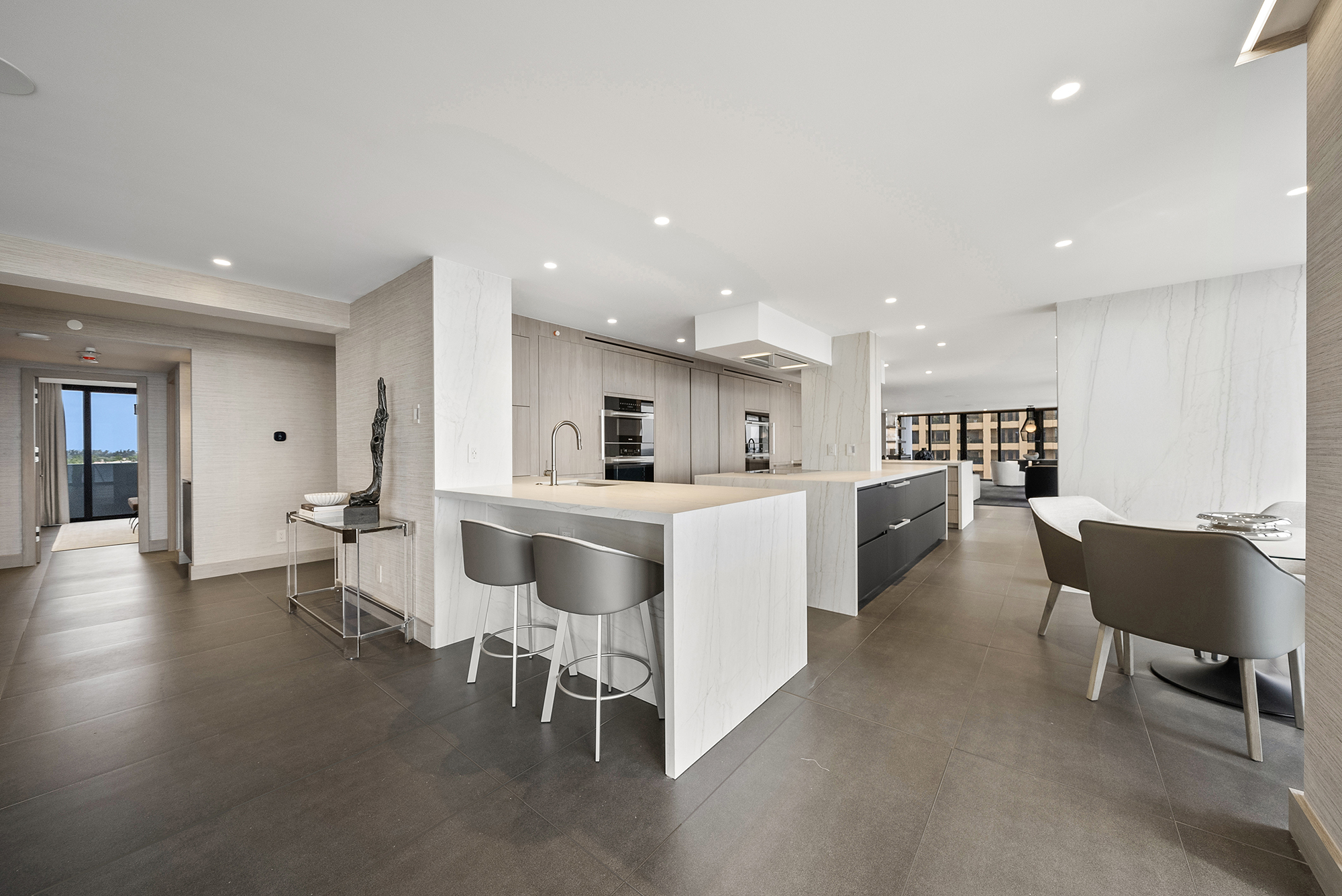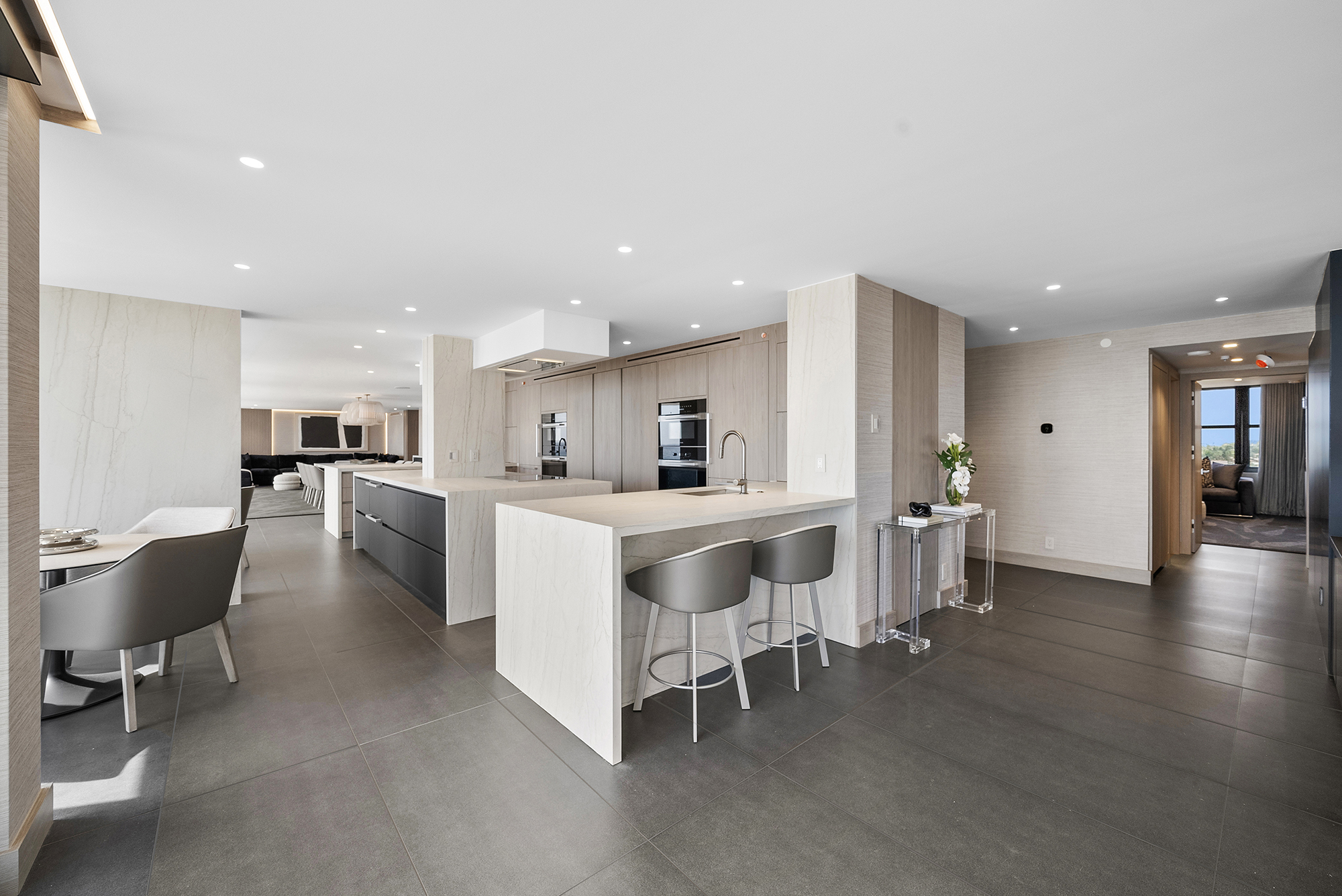 Modern Miami condo kitchen by Sourced Interiors — sleek cabinetry, marble countertops, and designer lighting