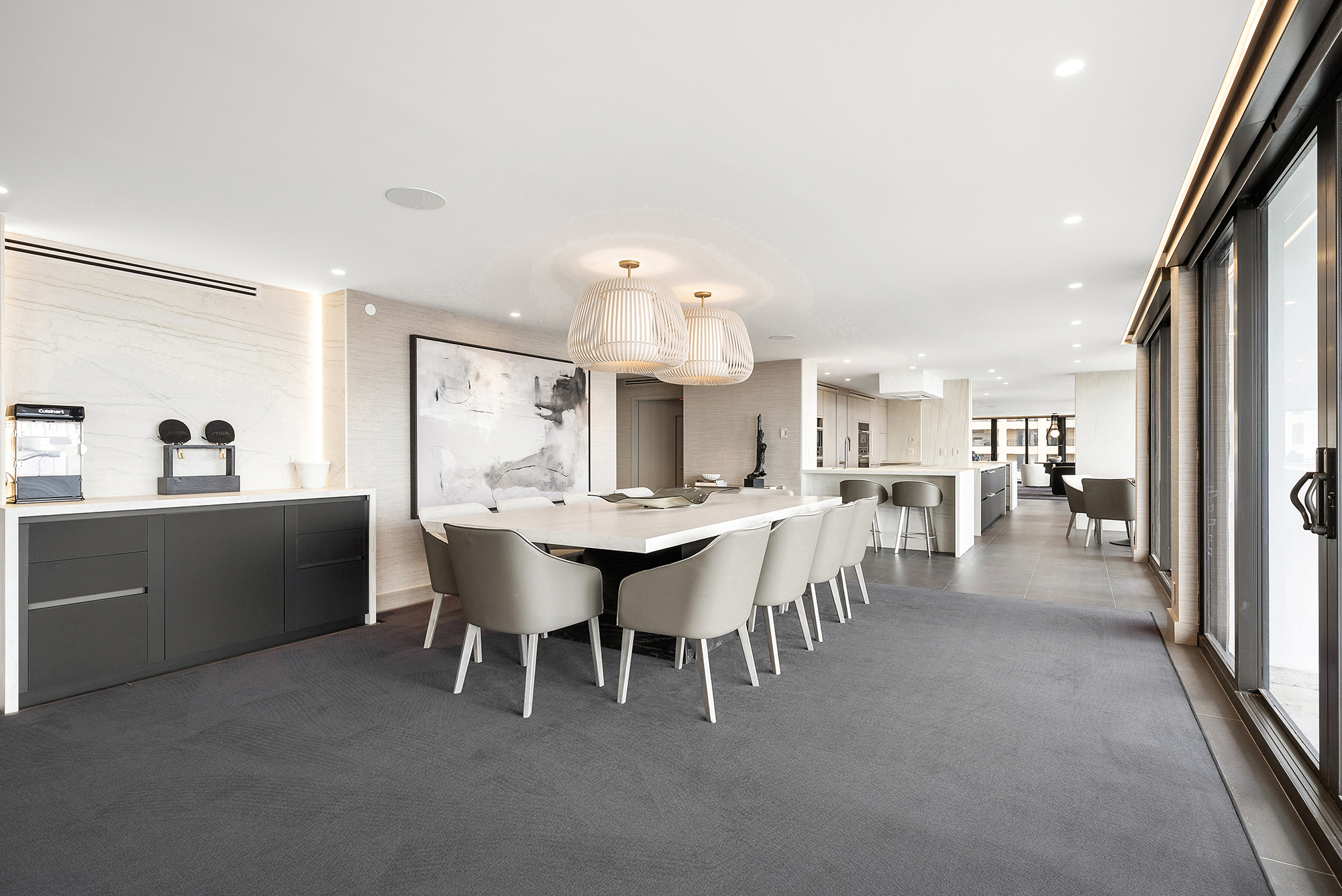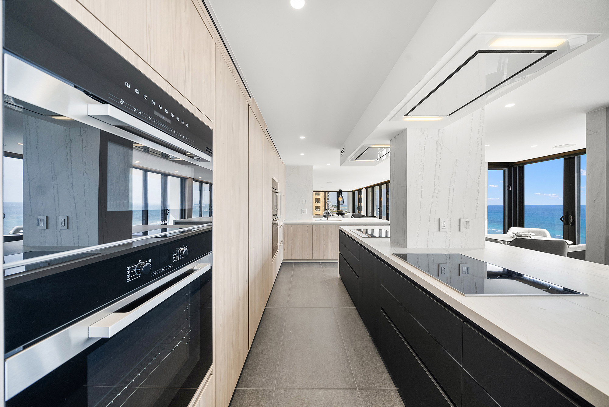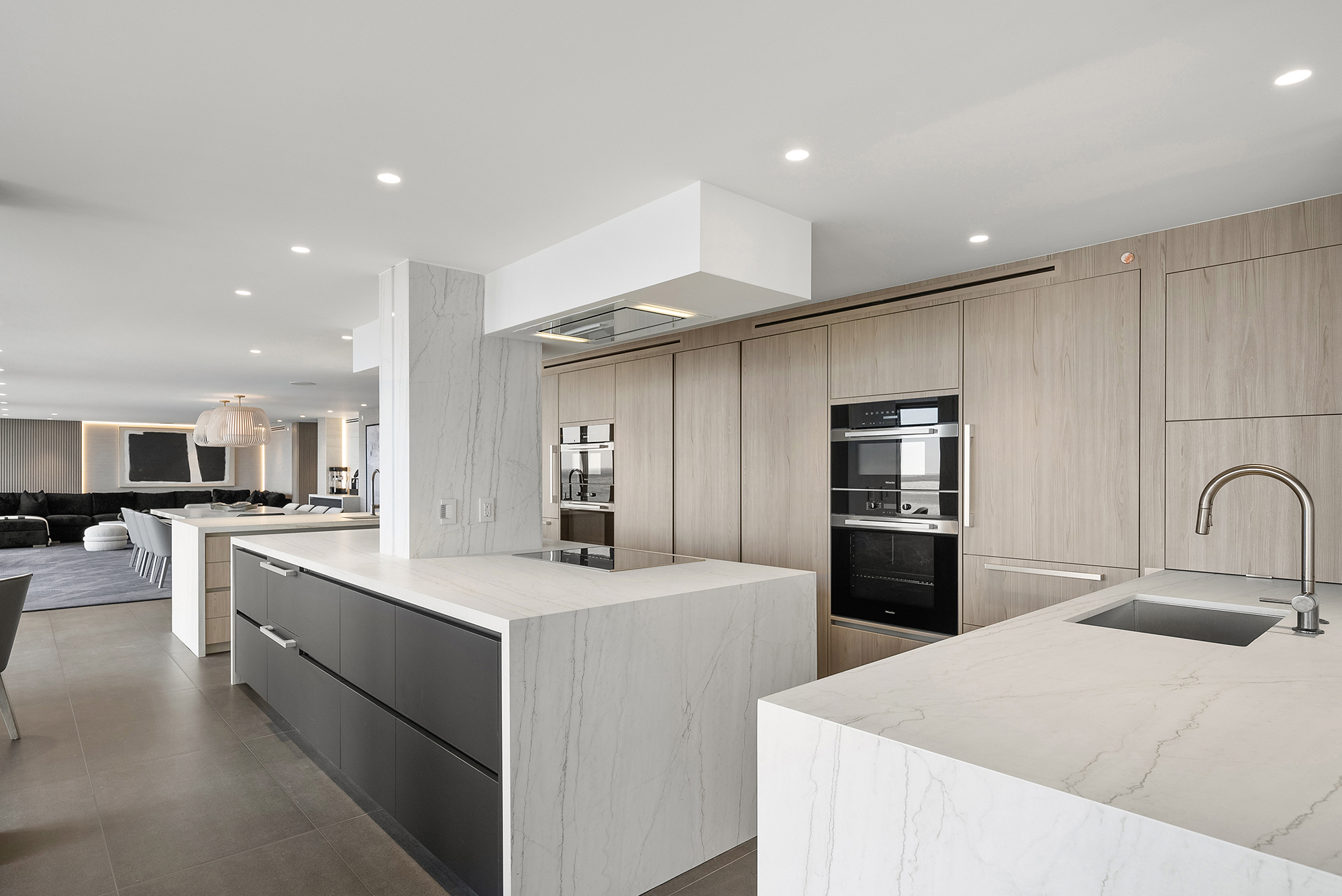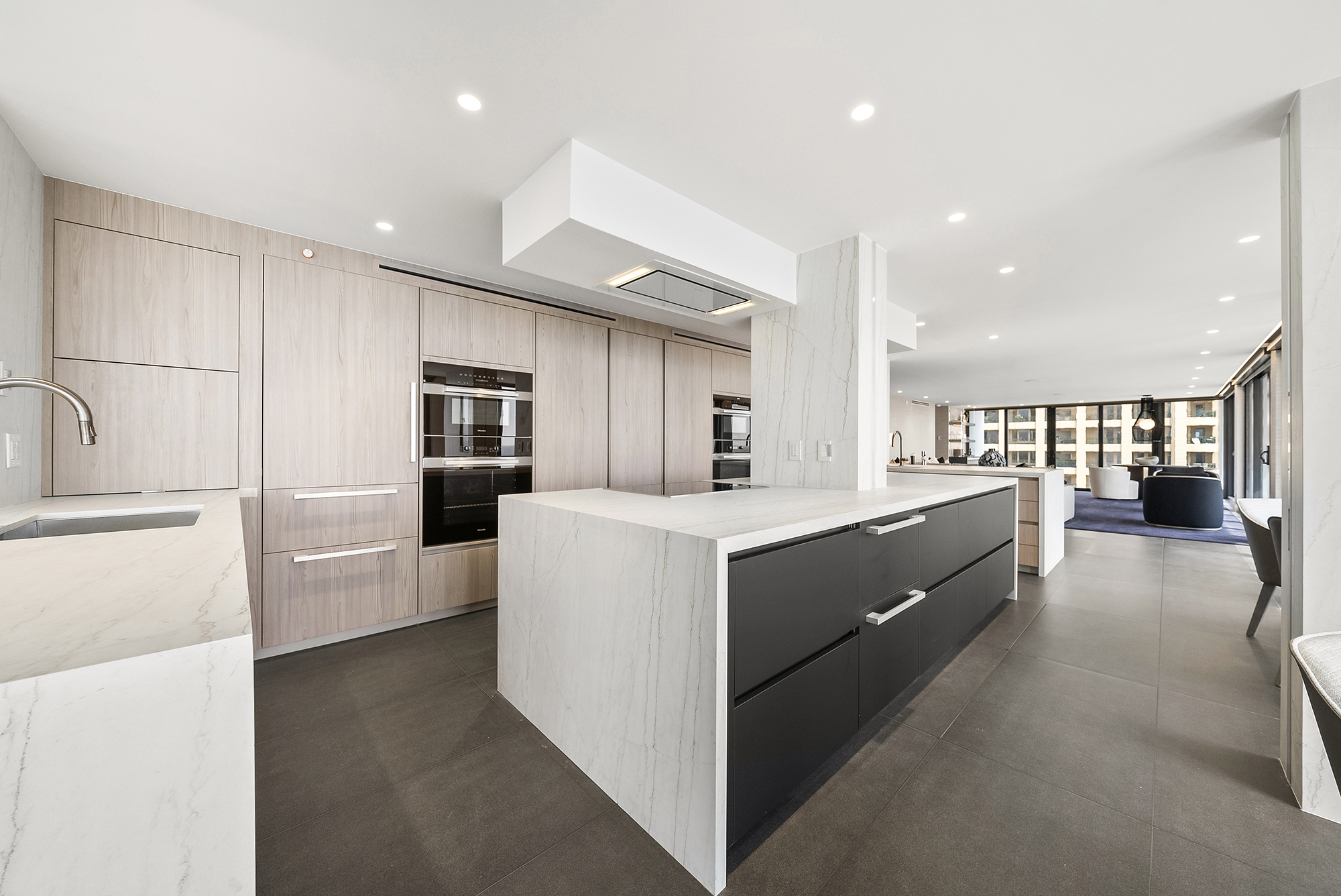 Modern Miami condo kitchen by Sourced Interiors — sleek cabinetry, marble countertops, and designer lighting